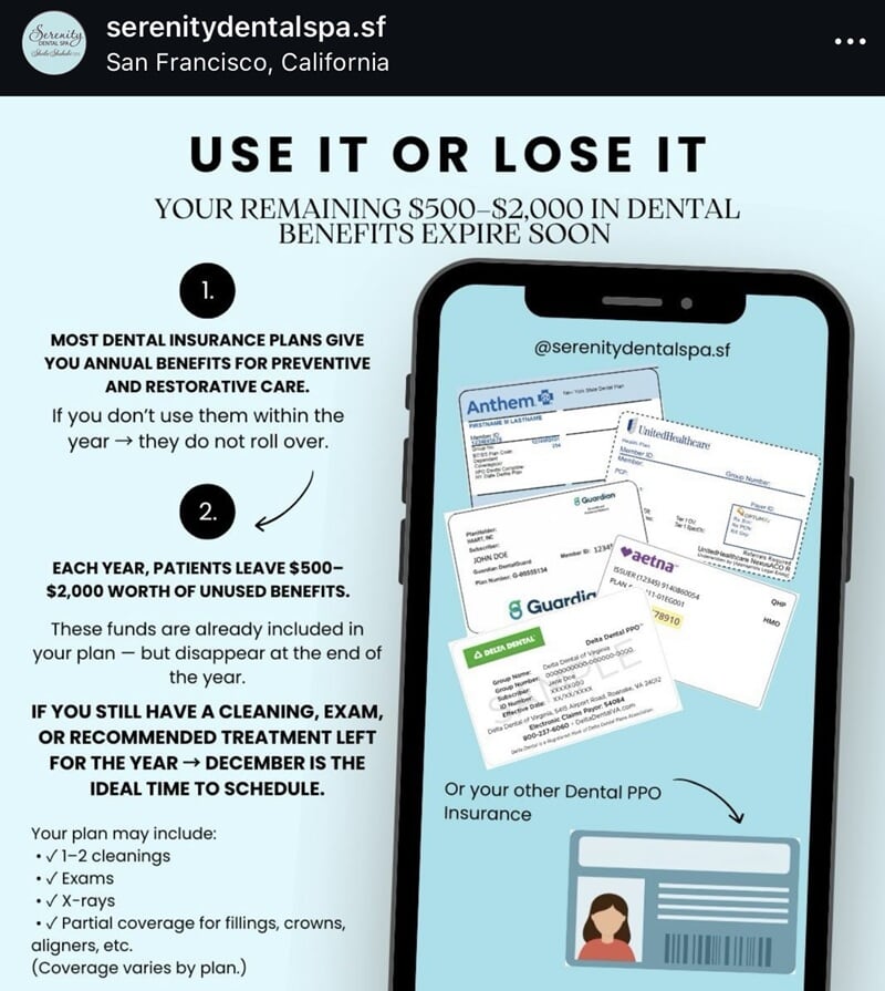 When you walk into the office of Serenity Dental Spa you will be immediately greeted by our friendly team who are dedicated to making sure that you feel comfortable during your entire appointment. We understand that patients can feel anxious when going to the dentist, and our team will take the time to listen to all of your concerns and help you understand exactly what your procedure is going to be like. At Serenity Dental Spa we pride ourselves on being an affordable family dentist that accepts a variety of insurance plans and payment options, like credit cards and checks because we want to provide a beautiful, healthy smile to everyone in the San Francisco area. Call Serenity Dental Spa today at 415-376-6196 to see why we are the dentist of choice in the San Francisco area.